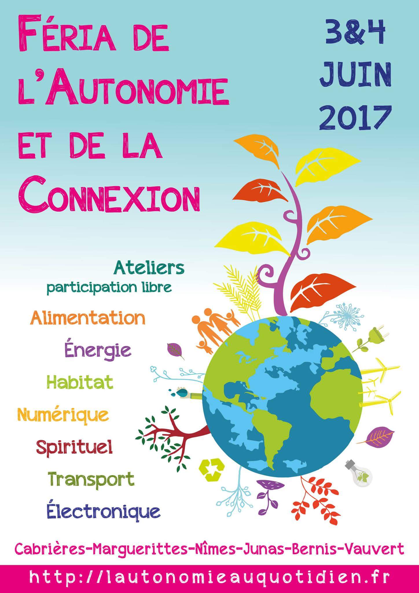 -> la Féria de l’Autonomie et de la Connexion dont le but était de relier le temps d’un week-end des éco-lieux alternatifs présents autour de Nîmes grâce à des moyens de transports + écologiques, pour montrer que « l’autonomie et l’écologie » ne rimaient pas avec « retour à la bougie »,