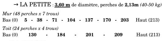 b. Pour calculer où percer les trous, du mur et du toit, c’est la même chose. Je prends le 1er trou multiplié par la hauteur des perches de la maquette divisé par la hauteur des perches de la « petite ».